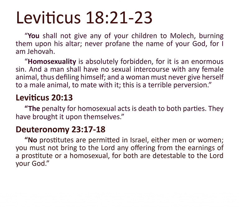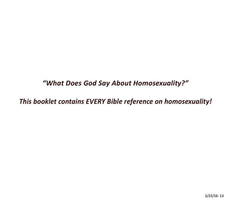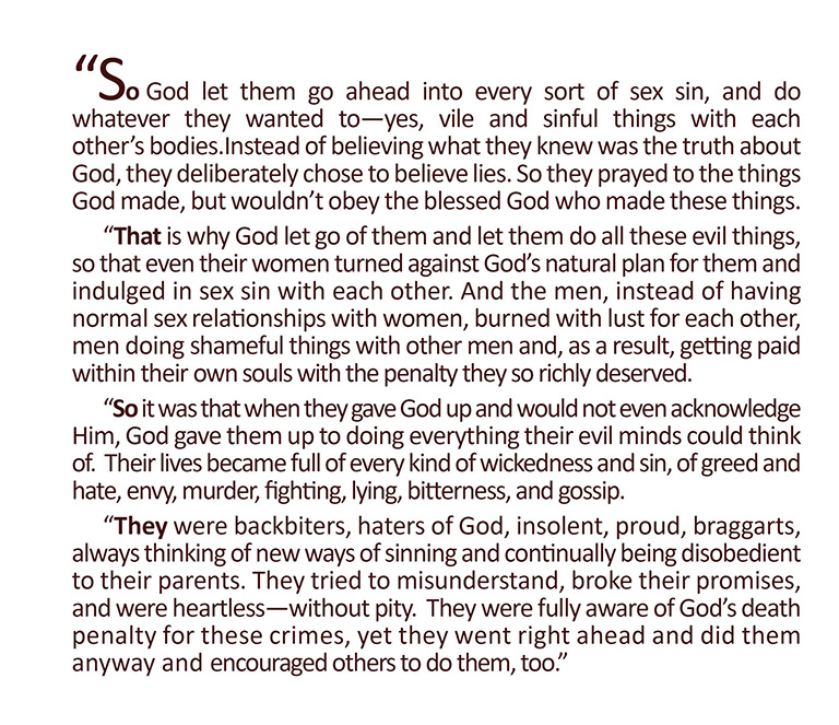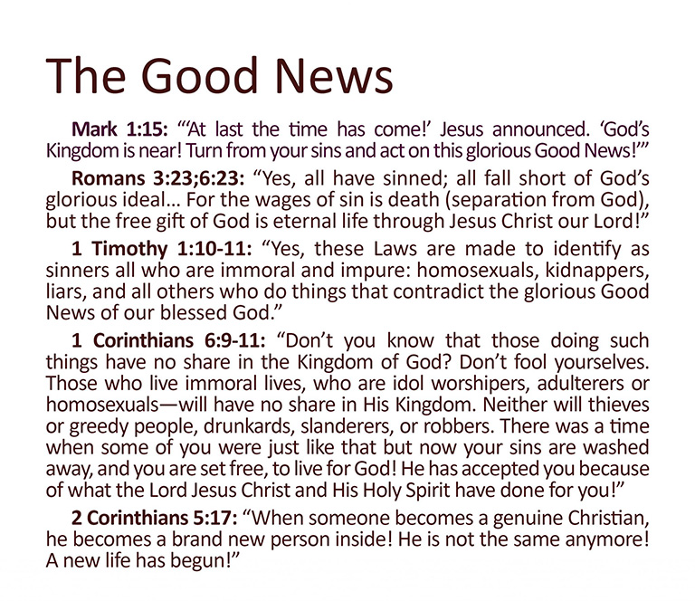 This topic is front and center in our culture today. The Bible has a lot to say about homosexuality. If Christians do not get God’s Word out to our nation on this subject America will suffer the same fate as Sodom and Gomorra. This pamphlet does not have one word in it other than God’s Word. It contains every verse in the Bible on the subject of homosexuality. There is not one written word of any editorial thought. It is only the Bible. For anyone to contend with what it says they will be only contending with God and the Bible. Christians need to get this into the hands of every state legislator, every city council member, every judge, and every congressman. It would be good if it was slipped into the door of every house in your city. If you would like to order these and would like to see a copy first, please email us.
