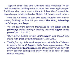 Did you know there were no church buildings until the 4th century? There is solid Biblical reason for this. Do you know why? Did you know the church model that God left for us was not like the traditional church today? Did you also know that the fastest growing and largest church movement in the United States (and the world) is the house church movement – and for good reason which you will discover in this very revealing pamphlet House Churches.