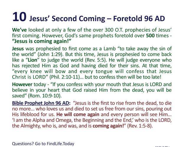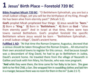 This pamphlet was originally written for the purpose to be given out at Christmas. And thousands have been distributed over the Christmas season. Teams of young people have put them on cars at malls during Christmas. People can insert them in their Christmas cards they send out each Christmas. Christ is still the reason for Christmas! And there is never a better time to get the Good News out about Jesus Baby than during Christmas. One Christian wanted to buy a full page in the major city newspaper and put the 10 Prophecies of Christmas Jesus. If there is ever a time to reach our city with the Good News of Jesus it is during Christmas. We are praying that millions will read 10 Prophecies of Christmas Jesus this Christmas season. Be sure and get your order in early!