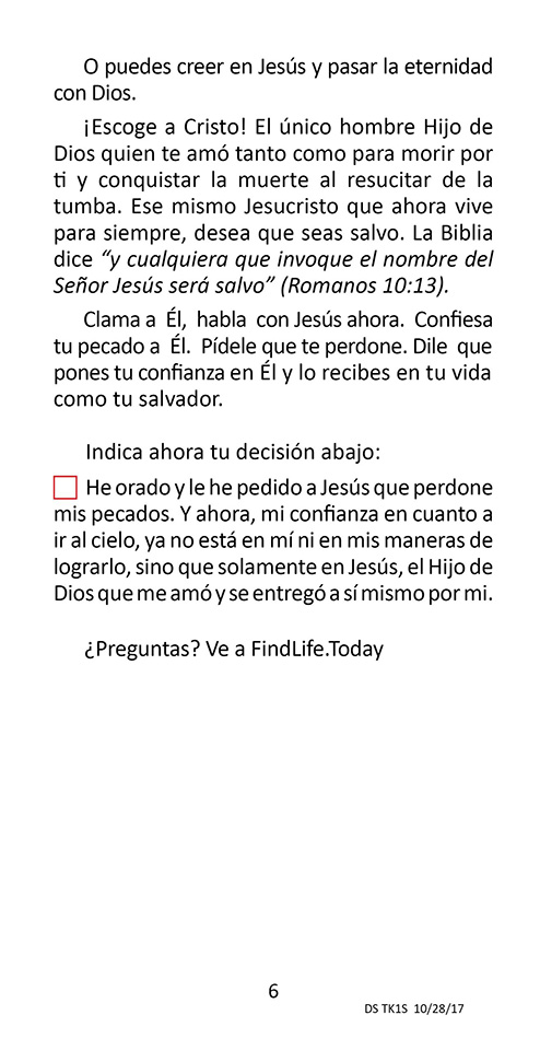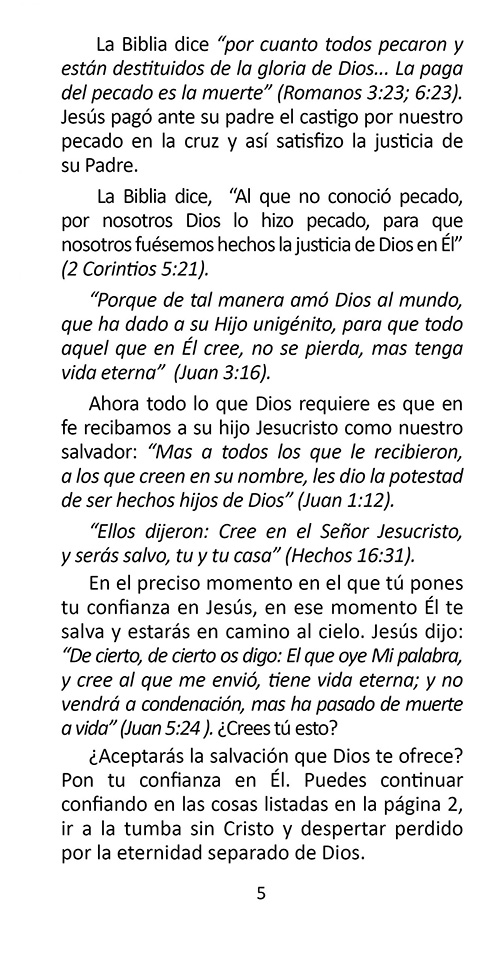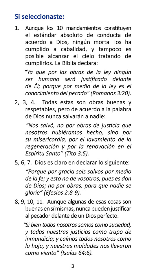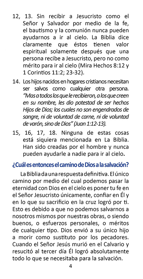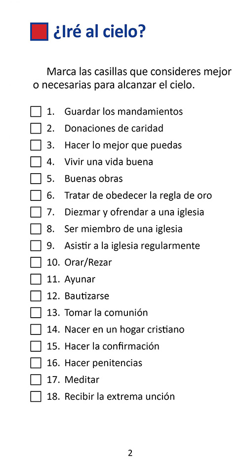 Este folleto del evangelio es bueno para todos, pero puede ser especialmente bueno para los católicos y para cualquiera que crea que sus buenas obras los ayudarán a llegar al cielo. En el folleto, la persona marca lo que espera que ayude a llevarlos al cielo. Luego leen un verso por cada cosa que marcan y descubren que la Biblia dice que ninguna de estas cosas los ayudará a llegar al cielo … pero solo pueden ir al cielo en el que confían y solo confiar en la muerte de Jesús en la cruz hizo para pagar por sus pecados.