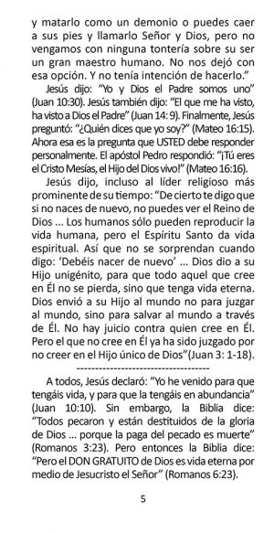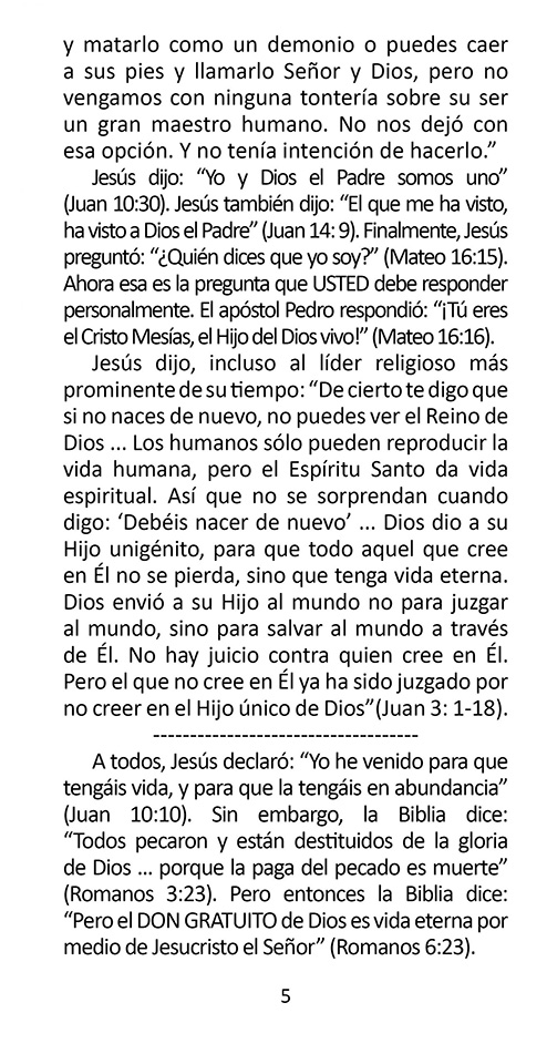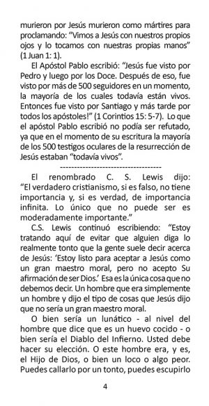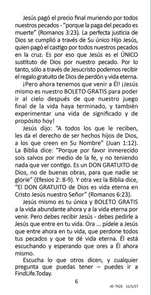 Este es un tratado del evangelio muy singular. Originalmente fue escrito para ser entregado a miles de fanáticos después de cualquier evento deportivo, después de cualquier partido de fútbol, baloncesto, béisbol, fútbol, etc. Presenta las Buenas Nuevas de Jesucristo de una manera muy clara y atractiva. Se incluye una cita poderosa de C.S. Lewis. Puedes dar este tratado del evangelio a cualquier persona en cualquier lugar. Pero es especialmente emocionante pensar en llegar a una ciudad entera con el Bien Nuevo de Jesús. Si usted y su grupo de jóvenes o cualquier grupo de creyentes, jóvenes o viejos, quieren tener un impacto en su ciudad, entonces su ciudad comienza a hablar de Jesús – ordene 10 de miles de boletos gratis, suficiente para llegar a todos dejando a todos los mayores eventos deportivos en tu ciudad. Esto cargará espiritualmente a cualquier grupo de cristianos para que pueda llegar a miles con el Evangelio. ¡Muchos podrían ser salvados! ¡Los nuevos cristianos podrían estar emocionados de conocerte y unirse a tu grupo! “Recuerda esto: el que siembra con moderación también cosechará escasamente, y el que siembra generosamente también cosechará generosamente”. (2Cor. 9: 6).